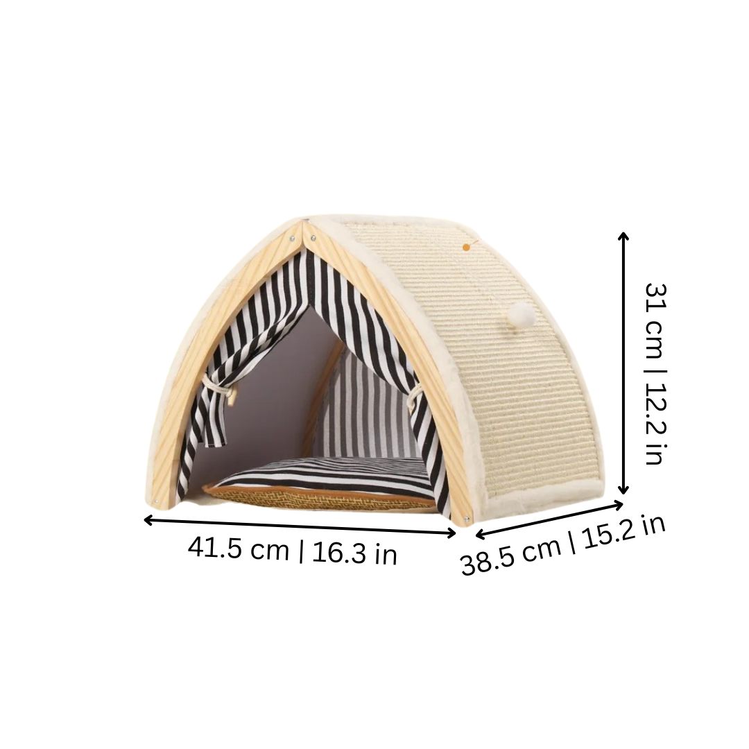 my cat climbed into this and just stayed there staring at me like yep this is mine now. the inside looks cozy and the top scratch panel makes it more interesting than just a plain tent bed. very cute and very cat approved
