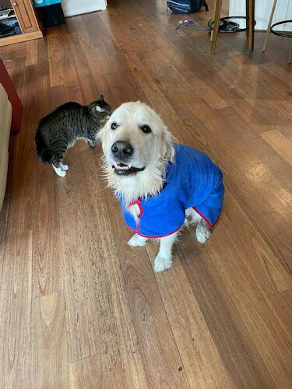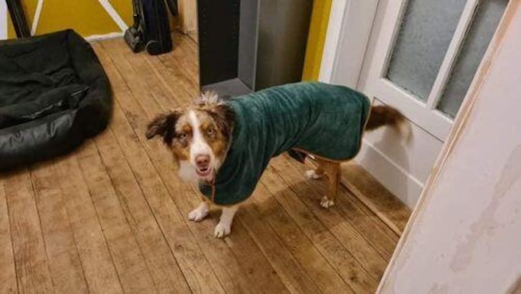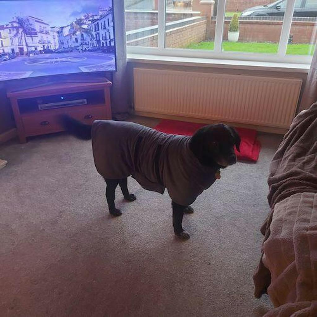 Poppy loves this, it keeps her cosy while it completely dries her . So easy to put on and take off . Great for her going swimming or just caught out in the rain I bought medium, which might look a tad big on her but you can adjust it with the Velcro . It is amazing and I would recommend you buy one for your dog